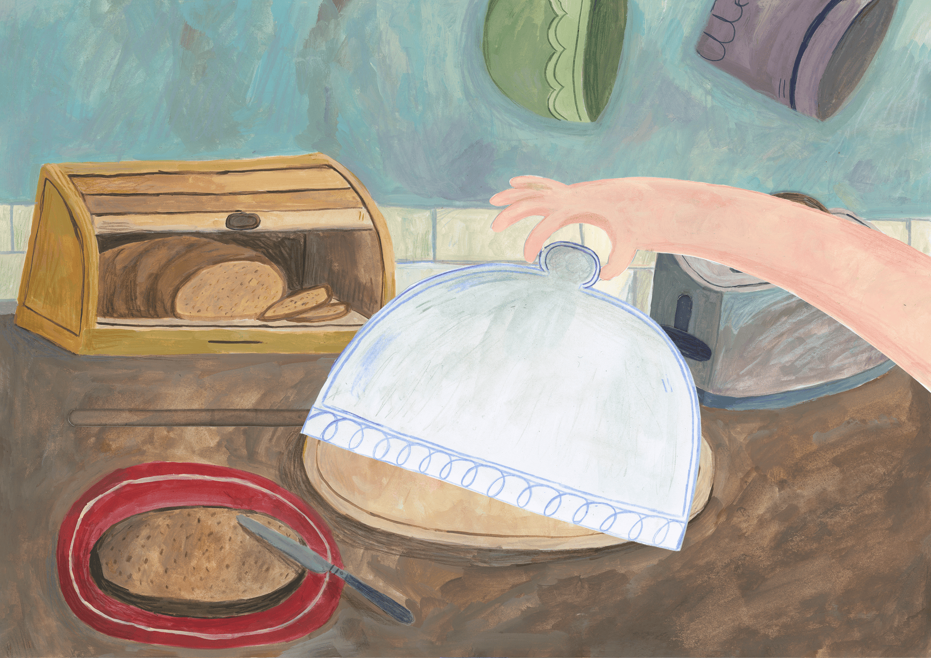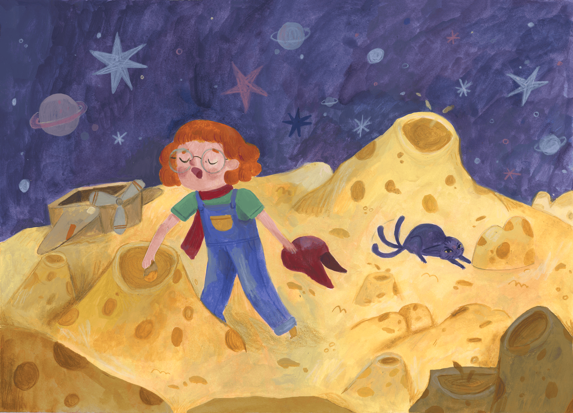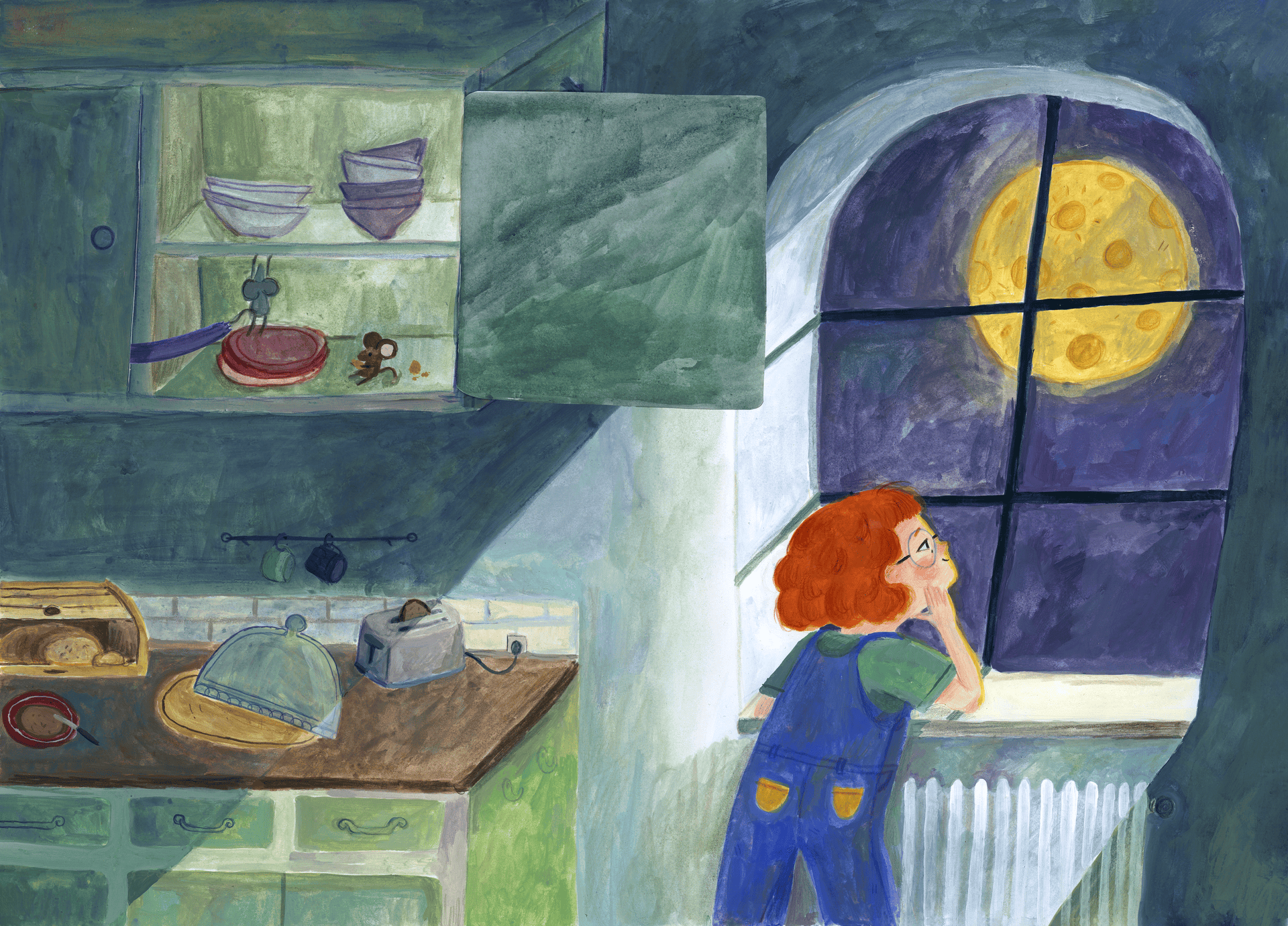 This is a mixed media piece made with gouache, pencil and paperengineering. It’s a silly little story about a girl wanting a cheese toasty but eventually having to go all the way to the moon for it.
