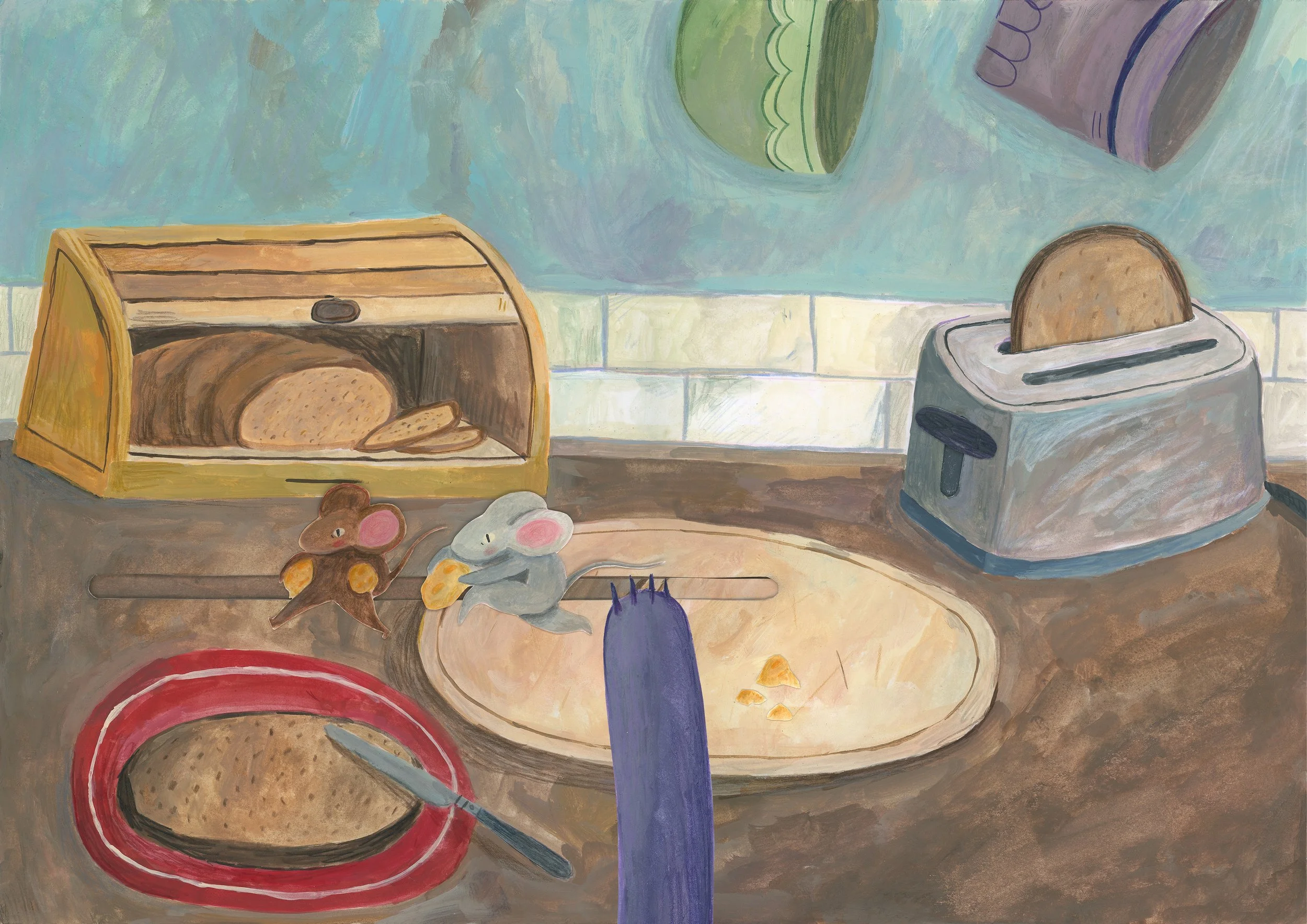 The toast and the mice both move on a pully system with little paper tabs at the edge of the page.