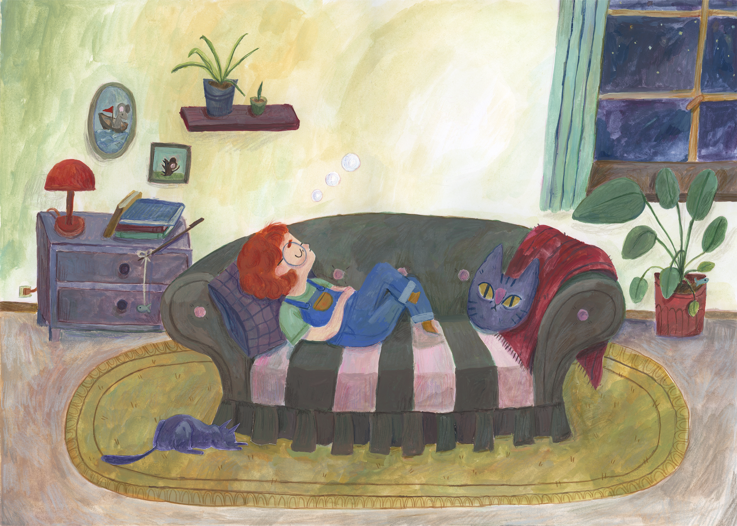 This is the page where the girl dreams of a cheese toasty. Two little flaps reveal her dream and also a mouse hiding under her sofa.